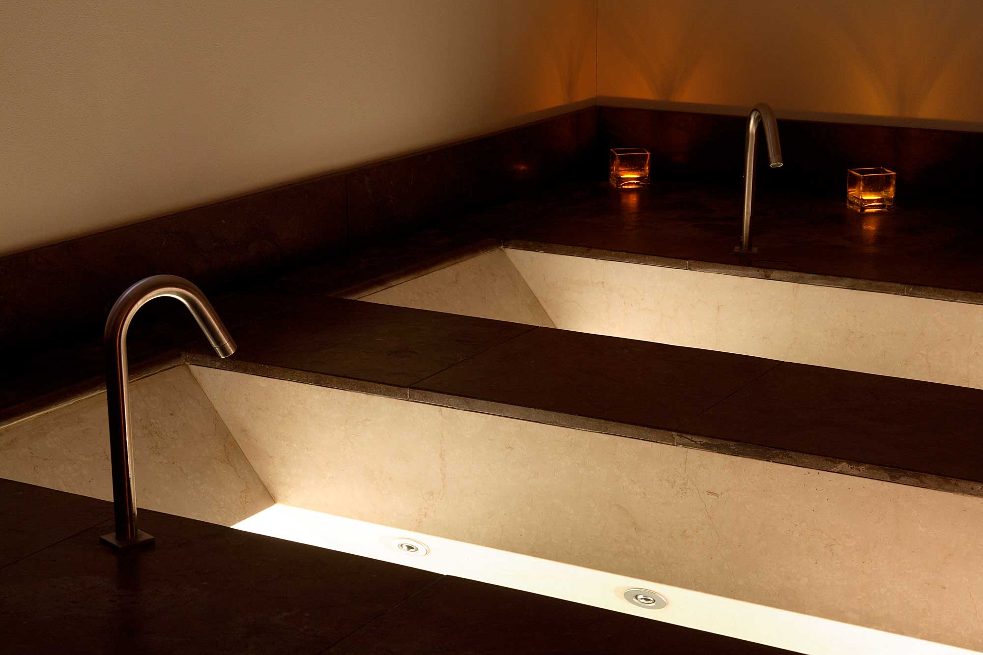 Nella SPA abbiamo utilizzato luci a parete e a pavimento, senza mai toccare il soffitto, tranne che per uno spot che illumina la fontana di ghiaccio. Luci tutte rigorosamente di color bianco o ambra, mentre nell’hammam e nel bagno di vapore l’illuminazione proviene unicamente da luci immerse nell’acqua. Particolarmente suggestivo è il contrasto della luce modulata che si crea attraverso l’utilizzo di un impianto altamente tecnologico che dà vita a scenari luminosi, sospesi tra realtà virtuale e non. Per ravvivare un corridoio, abbiamo progettato e realizzato una sequenza di coni in metallo brunito, che spuntano dal pavimento e fanno da vaso di raccolta d’acqua, gli stessi nel contempo illuminano il percorso tramite delle luci immerse, creando dei riflessi di onde sul soffitto. Questo lavoro ha richiesto un attento studio idraulico, per permettere che l’acqua che trabocca dalla parte superiore del cono, riuscisse a scivolare in contro-pendenza fino a sparire alla base, senza cadere sul pavimento.